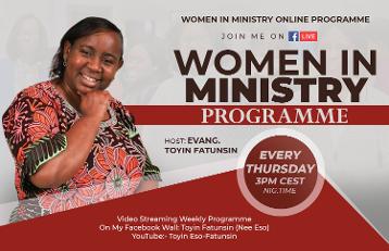 JOIN EVANG. TOYIN FATUNSIN ON HER WEEKLY PROGRAM FOR WOMEN IN MINISTRY EVERY THURSDAY 3PM CEST ON FACEBOOK OR YOUTUBE.