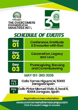 Established on May 3rd 1996, The Overcomers Evangelical Ministries has been growing by the help of God. Join us to celebrate 30 years of his help in Zaragoza Spain May1-3, 2025.